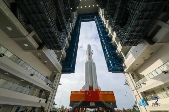 长征五号遥五火箭转运到发射塔架。(图片来源:国家航天局)