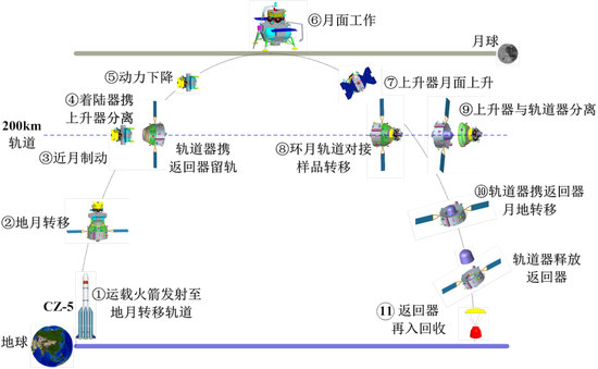 从任务的操作来看,包括两次发射——地面发射与月面发射,两次着陆——月面着陆与地球着陆,两次封装——月面封装与月轨封装,一次交会对接——月轨对接。
